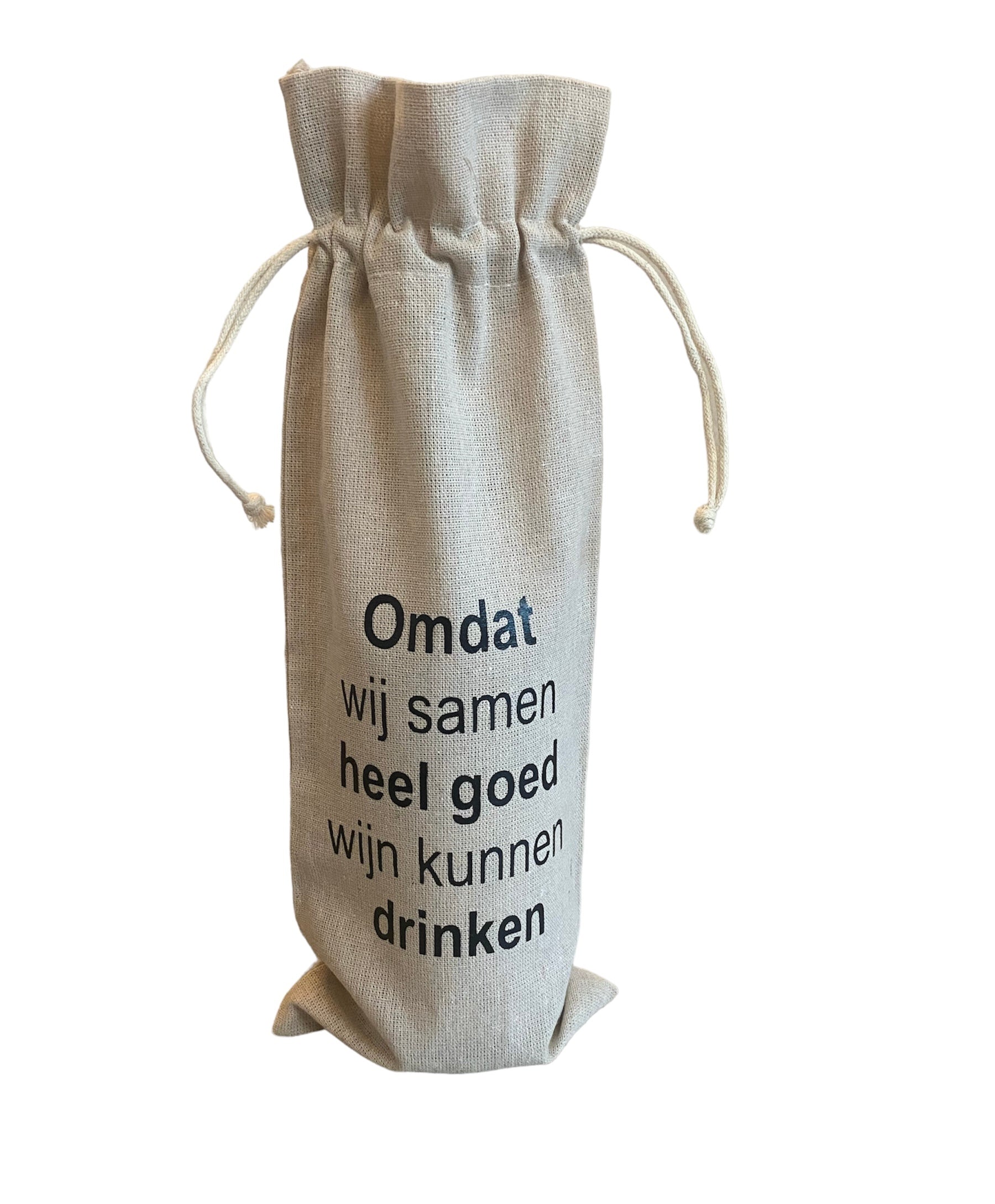 Geef je wijncadeau een persoonlijke, humoristische uitstraling met deze wijnzak. Perfect voor een avondje samen genieten van een goed glas wijn!